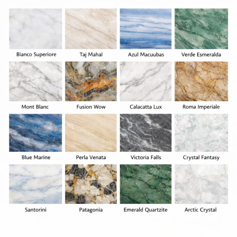 Já o quartzito se destaca pelo visual mais sofisticado, com veios naturais marcantes e maior valorização estética. Além disso, oferece resistência superior ao mármore e excelente durabilidade para uso em cozinhas e áreas gourmet.